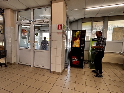 В помещении: пол - керамогранит, потолок - армстронг.