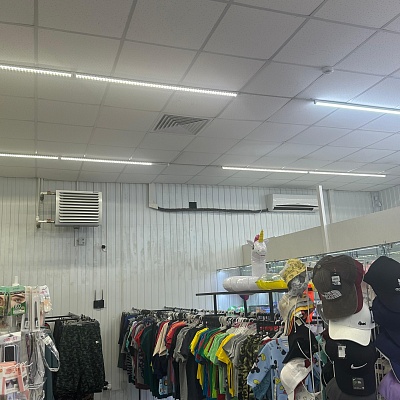 В помещении: пол - керамогранит, потолок - армстронг.