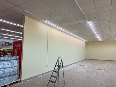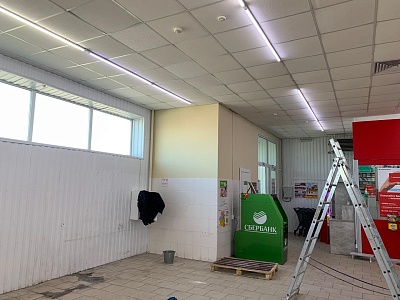 В помещении: пол - керамогранит, потолок - армстронг.